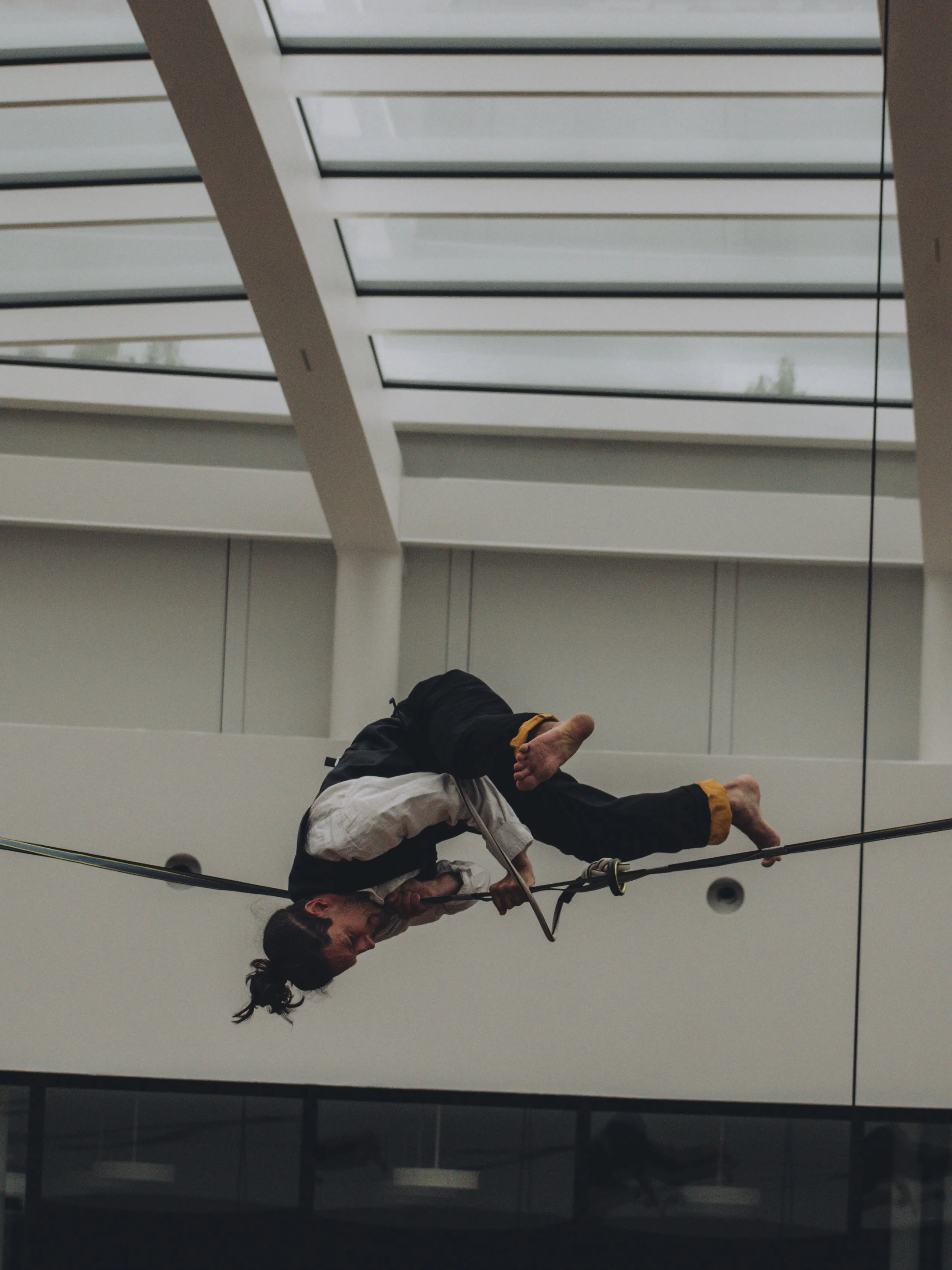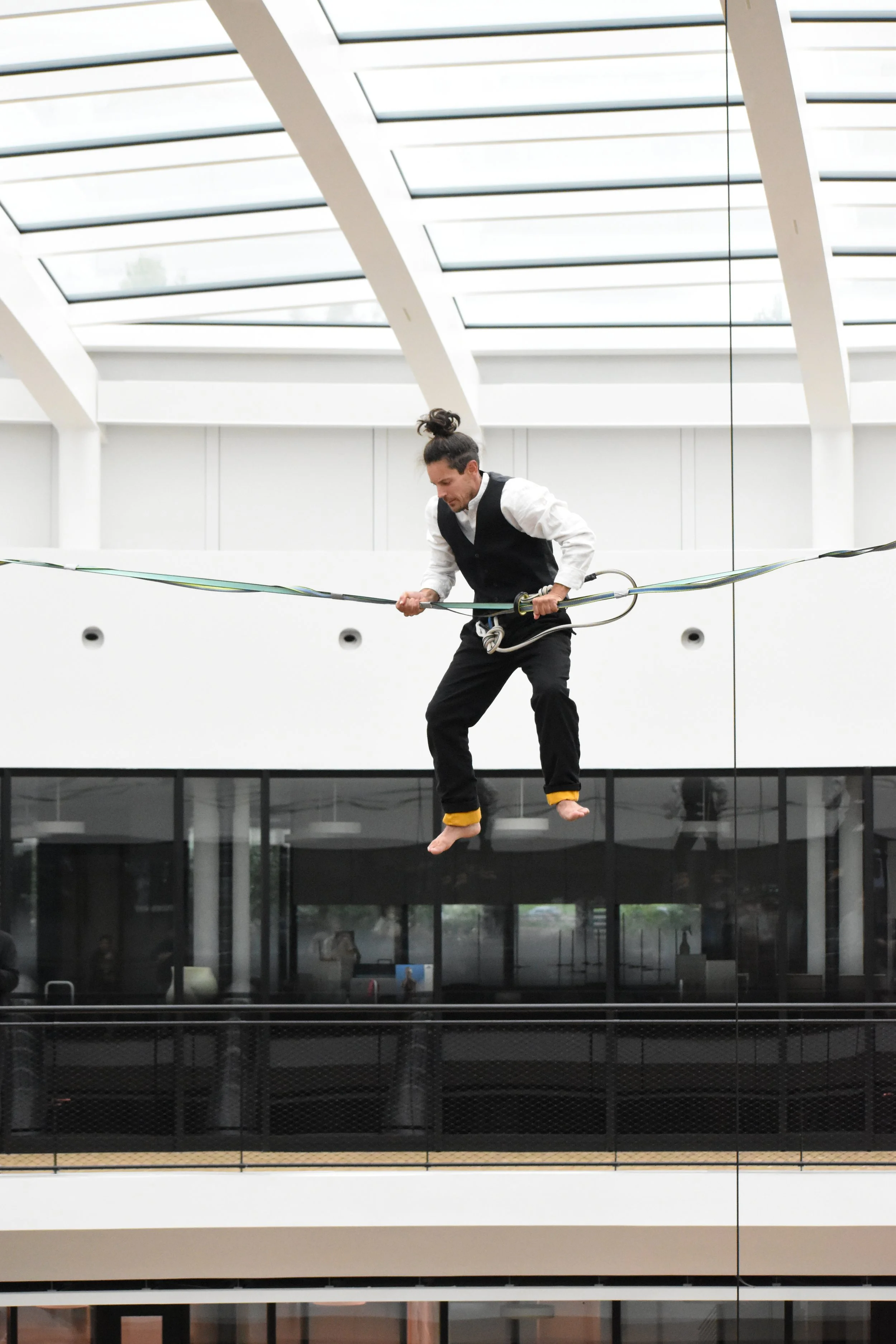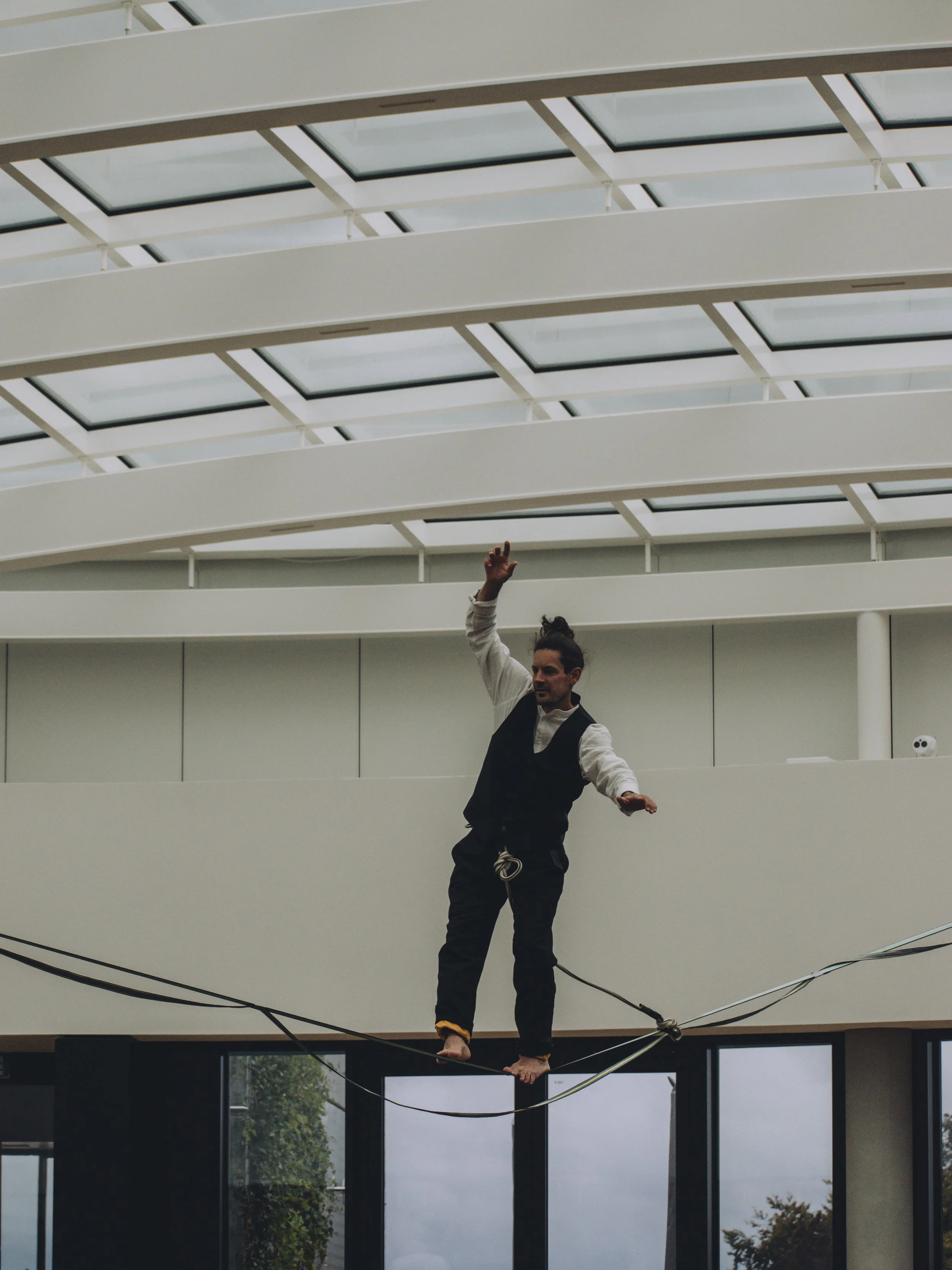 Le défi principal venait du lieu. La performance se déroulait à l’intérieur d’un nouveau bâtiment, avec une ligne tendue à environ 15 mètres de haut, visible depuis plusieurs étages. Le public pouvait se répartir sur quatre niveaux autour de l’espace central. Cela créait une belle force visuelle, mais imposait aussi une préparation très précise : points d’ancrage, protection des surfaces, circulation du public, timing d’ouverture et lisibilité du spectacle depuis différents angles.